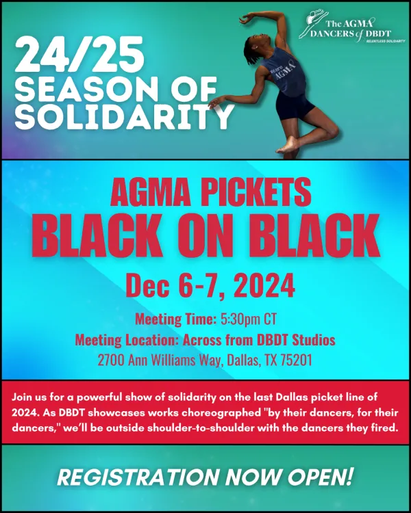 Our courageous Fired Black Dancers have won every battle so far. The National Labor Relations Board filed more than 40 unfair labor practices charges against management. The Dallas City Council voted unanimously against union busting. The City’s committee on Quality of Life, Arts, and Culture has recommended taking away management’s $248,000 subsidy. Attendance is low at the scab performances we picket.