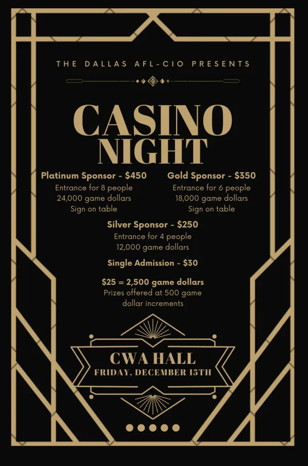 Dec 15, 7:30P: Dallas Central Labor Council Christmas Casino Party