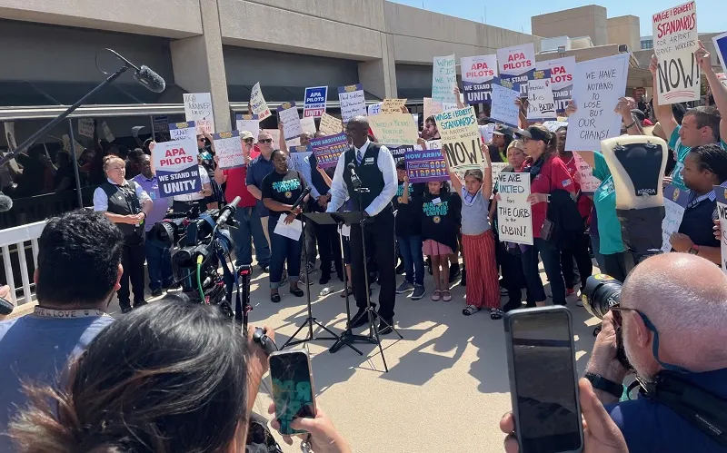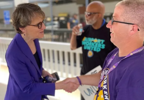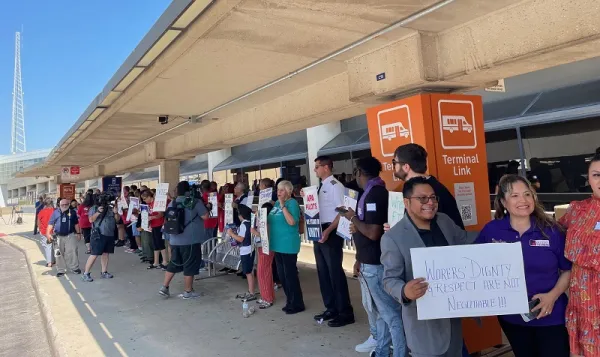 Cesar Calderon, organizer with the Service Employees (SEIU), reports that over 200 people rallied on Wednesday, the hottest day of the year, at DFW Terminal C. Among them was the International SEIU President, Mary Kay Henry. Calderon provided photos: