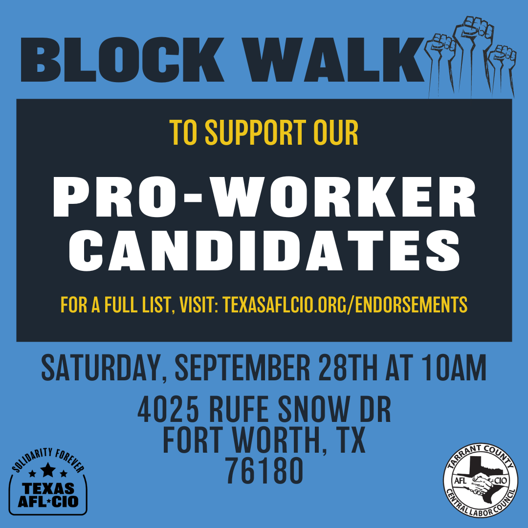 Events Tarrant County Block Walk September 28, 2024 9:00AM - 1:00PM 4025 Rufe Snow DrFort Worth, TX76180 RSVP Here Social share icons Come join Tarrant County CLC in block walking for labor endorsed candidates starting Saturday, September 28th, every other Saturday, until Election Day!