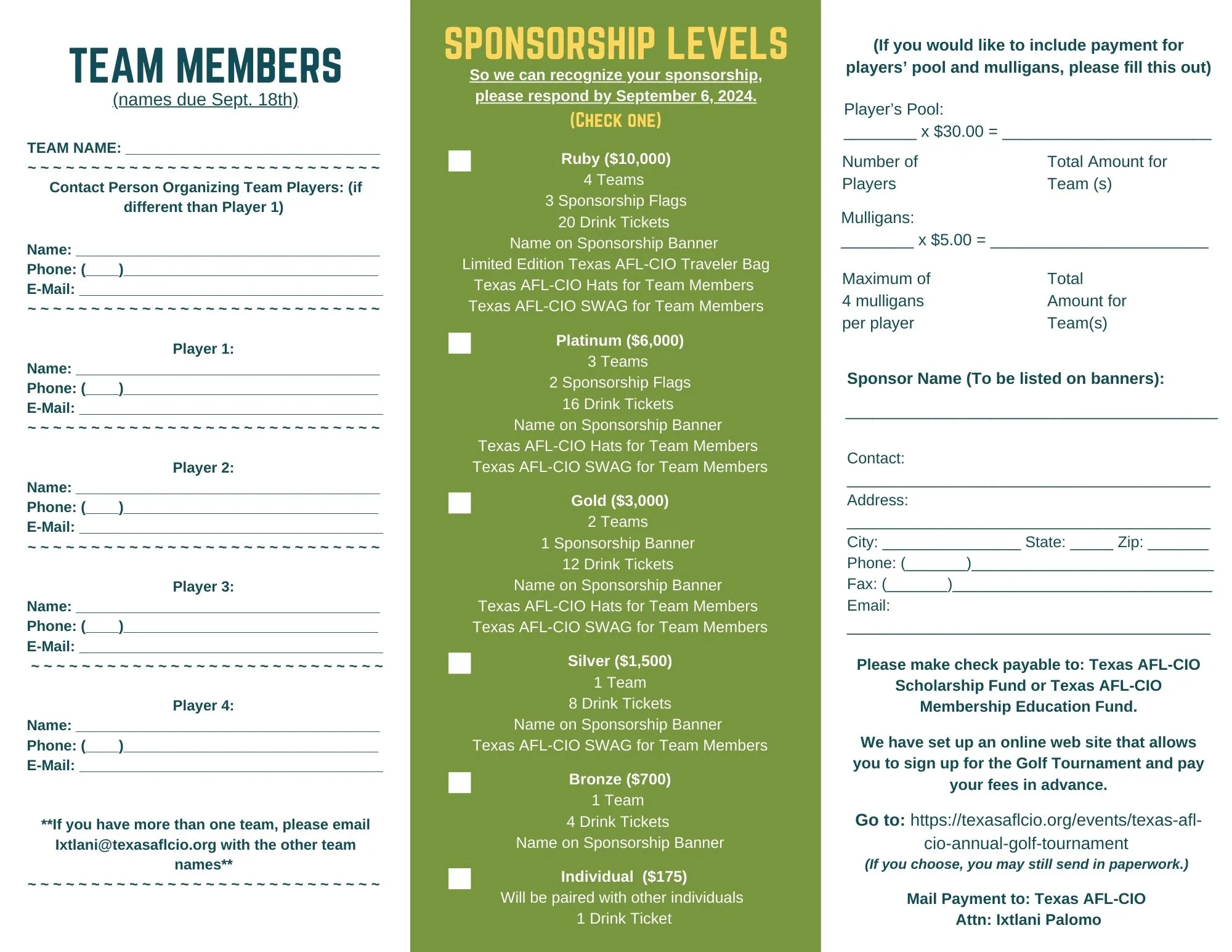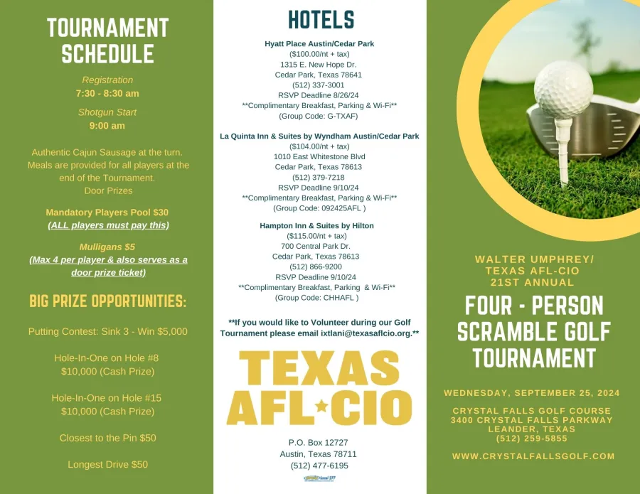 The 22nd Annual Texas AFL-CIO • Walter Umphrey Golf Tournament will be a day of camaraderie and relaxation in the Texas union movement. It is also a significant fundraising event for the state labor federation.